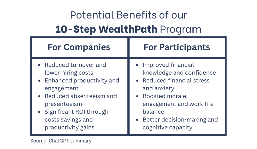 “Investing in our 10-Step WealthPath for Teams program enhances employee retention and job satisfaction by equipping executives with the knowledge and skills they need to become highly effective personal investors. It positions the company as an employer of choice, attracting and retaining top talent. The program supports leadership development and career growth, equipping professionals with the acumen needed for senior roles, and strengthening the internal talent pipeline,”