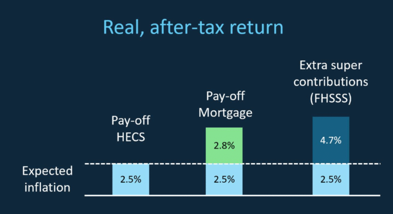 Paying down debt is a form of saving. What is the after-tax return to paying down debt? It is the interest rate on the debt. The interest rate on HECS debt is the inflation rate. That is the rate at which your HECS debt increases. So, the real (after-inflation), after-tax return to paying down HECS debt is zero.